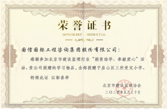 2024年5月30日,由北京市建设监理协会组织的监理行业“捐资助学 奉献爱心”活动,在房山区宝健希望小学隆重举行。国信国际工程咨询集团作为北京市建设监理协会理事单位,携手52家企业代表共同参与了此次活动,并出席了捐赠仪式。