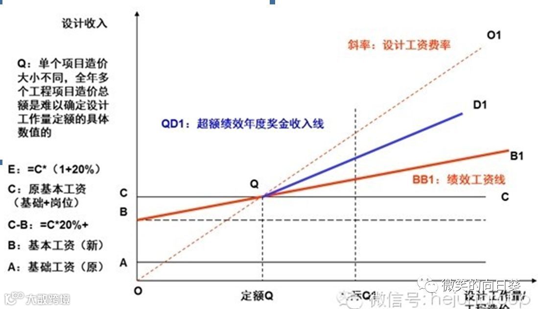 图1说明:关系图模型可以应用到部门、项目组、个人等三种情况。A点为岗位原基础工资,C点为上年度基本工资线,即职级工资,包括基础工资和岗位工资。C点值减A点值为岗位职级工资。OO1斜线为全额计件的设计工资费率。新工资方案取B点为新的基本工资线,BB1线为将原“职级工资”转变为“基本工资+计件工资”的方案设计绩效工资线(红色实线),为了鼓励多劳多得,超出定额Q点的工作量,公司在年底给予超额年度绩效奖金,形成QD1超额奖金收入线(蓝色实线)。公司设计部门或设计岗位人员的薪酬曲线为由B到Q到D1的一条折线。