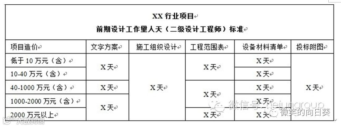 2)按不同行业客户项目,确定了前期设计工作量与项目造价对应关系表(表中数字略)。
