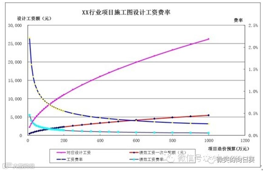 图3说明:图中对应设计工资线(粉色)相当于图1中的OO1线的设计工资费曲线,随着项目造价的递增,项目的设计费用占项目造价的比例(即费率)下降;图中绩效工资一次分配额线(红色)为公司按项目分配到项目组的绩效工资额度。