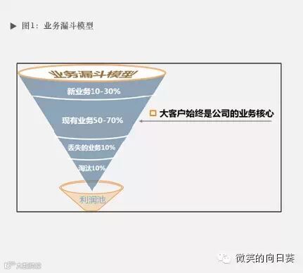 其次,工业品企业的研究发现,带来一半或超过一半销售收入的往往是为数不多的某组客户,我们称之为5%模型,即5%的客户带来了超过50%的公司收入。如果有一个客户恰好在这个关键的5%核心之内,那么显然它就是不能失去的最佳机会之一,即我们的大客户。