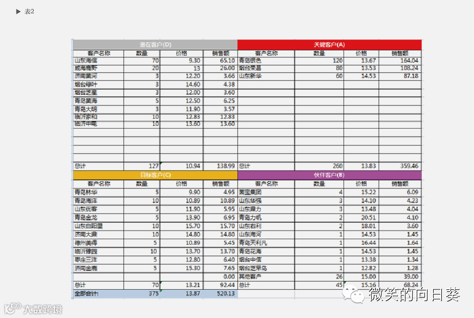 大客户管理的核心内容之一是进行客户分类管理,以更合理的配备资源及提高销售效率。某公司的客户分类示例:(见表2)