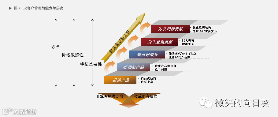 工业品企业和客户的关系可分为交易型关系、价值型关系及战略合作型关系,随着和客户关系的深化和提升,公司的市场地位和竞争力逐步得到加强,所以从经营产品到经营服务、从经营服务到经营解决方案、从经营解决方案到经营客户的业务组织管理问题是工业品企业发展的惯常战略路径;而实现这一战略升级的关键就是提升大客户管理的能力和层级(见图3)。