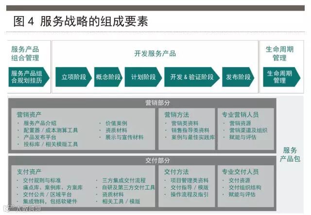 开发服务产品:描述单个服务产品项目如何完成立项、产品概念、计划、开发及验证、发布的全过程,最终输出“服务产品包”。这个服务产品包又包括营销和交付两部分内容,服务产品包连接服务营销和服务交付,连接物理产品和服务工作,是服务标准化的基石。