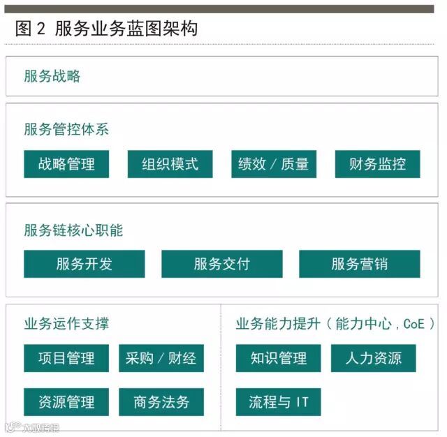 传统制造业公司如何在现有产品基础上向服务延伸和转型?如何规划和落实?我们认为,这些企业首先需要了解整个服务业务的全貌,即搭建一个业务蓝图架构,然后再针对蓝图中的具体模块和要素有序地建设、推进和落地(见图2)。