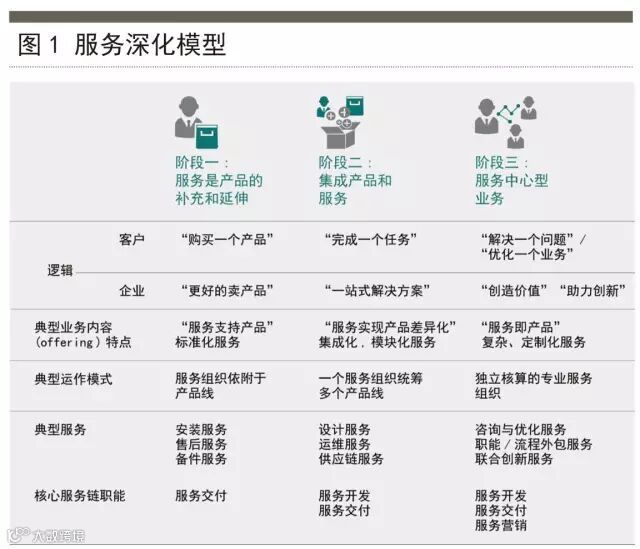 这两个动因也决定了制造业向制造服务业延伸和转型的规律。如图1所示,我们可以用“服务深化模型”将转型变革划分成三个阶段。阶段一,多数制造业公司从“产品的补充和延伸”开始涉足服务业务,其所提供的服务主要用于支撑产品销售,服务交付管理成为这一阶段的核心“服务链职能”。阶段二,企业开始意识到,集成的“产品+服务”模式,能够为客户提供“一站式解决方案”,从而更好地完成任务并增加客户黏性。企业由此加大对服务的投入,“服务开发”与“服务交付”成为核心职能。阶段三,一些公司在服务业务中获得了超过预期的收益,并且将“依靠服务创新来帮助客户解决难题、优化业务、推动变革”作为自身的使命,从而逐渐转型为“服务中心型组织”,以服务驱动业务发展。而此时,“服务营销”职能的重要性也日益凸显出来。
