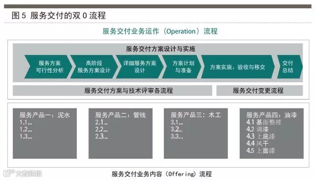 流程是服务交付的灵魂。交付是否优异,很大程度上取决于交付流程是否清晰、定义是否合理并严格遵守。多数情况下,服务交付流程包括两种流程,即双O流程——Operation(业务运作)+Offering(业务内容)流程。