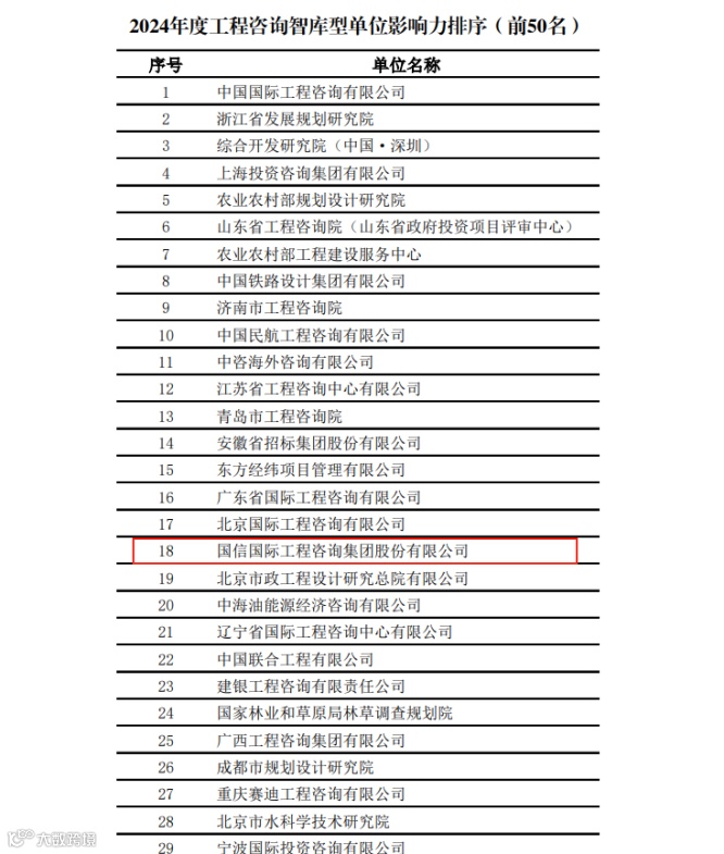 在中国工程咨询协会发布的2024年度工程咨询智库型单位影响力排名中,国信集团凭借其在政策研究、决策咨询等方面的突出贡献,从全国众多参评单位中脱颖而出,位列全国第18名。这标志着公司作为“新型智库”的服务能力和行业影响力获得了国家级行业协会的权威认可。