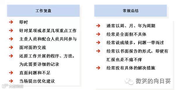 工作复盘不是常规意义上的总结,通常的总结都是按月、按季、按年等,但这不够,工作复盘则是针对某一项工作,或者已经完成,或者进入了关键的里程碑节点,把涉及到的相关人员召集在一起,进行即时、及时的复盘。