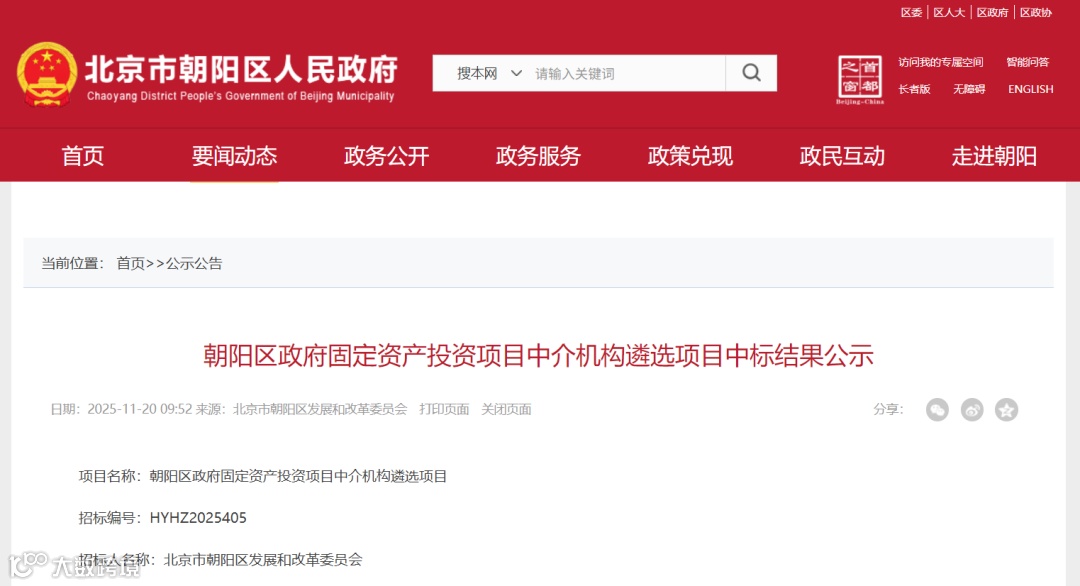 近日,北京市朝阳区发展和改革委员会发布《朝阳区政府固定资产投资项目中介机构遴选项目中标结果公示》,国信国际工程咨询集团股份有限公司凭借扎实的专业能力、丰富的行业经验及优质的服务口碑,在咨询评估标包(第1标包)(招标编号为:HYHZ2025405)中脱颖而出,成功入选该项目中介机构名录。