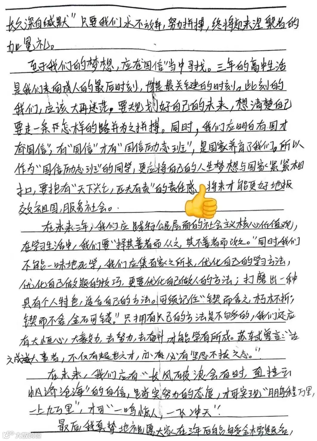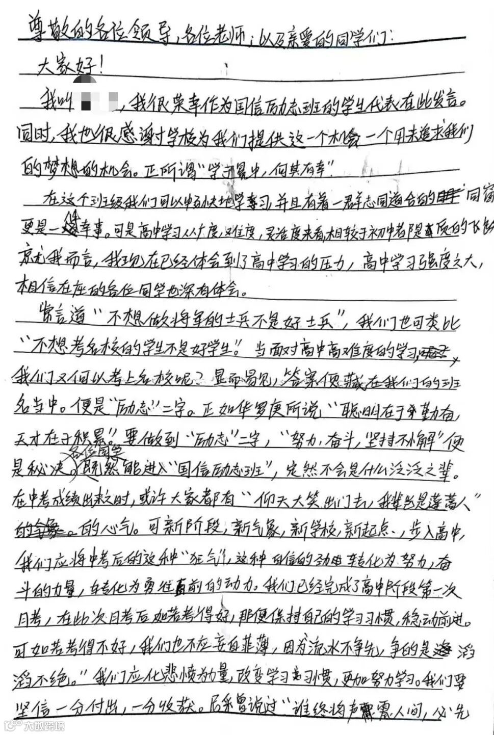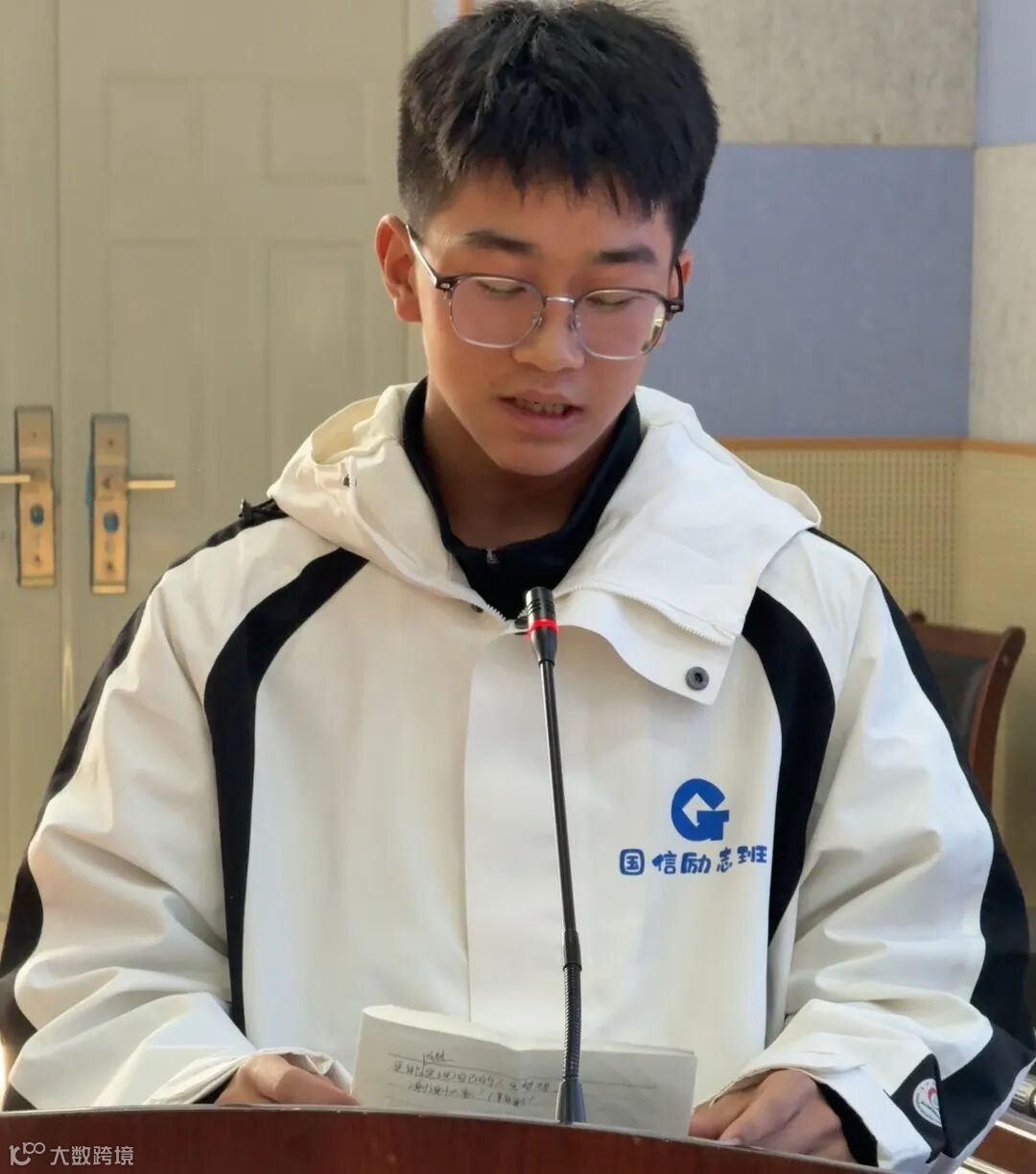 班长带领国信励志班全体同学庄严宣誓后,代表全体同学进行发言,他围绕高中学习的挑战与应对,规划未来心系家国,持之以恒追求卓越等方面发言,同时也代表全体同学表达应常怀感恩之心,不负期望、努力成才的决心。