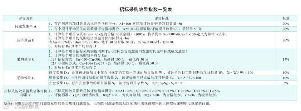 招标采购活动的实施效果表现涉及多个方面,需要分层分级进行评价指标体系构建,本文以后评价理论体系为基础,对招标采购活动实施效果评价的指标进行分析构建,构建出涵盖问题发生率、经济效益、采购效率、采购人满意度等四个方面的评价指标体系。
