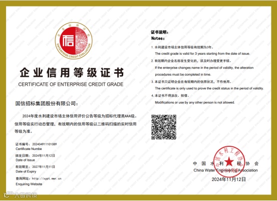 2024年11月,在中国水利工程协会举办的“2024 年度水利建设市场主体信用评价”活动中,国信招标集团股份有限公司(简称国信招标集团)凭借在水利招标代理领域的卓越表现和良好的信用记录,首次获得AAA级最高信用评价。这一荣誉,不仅是各级主管部门对国信招标集团多年诚信经营、规范操作的肯定,更是对其为水利行业建设做出的积极贡献、良好形象和信誉的认可。