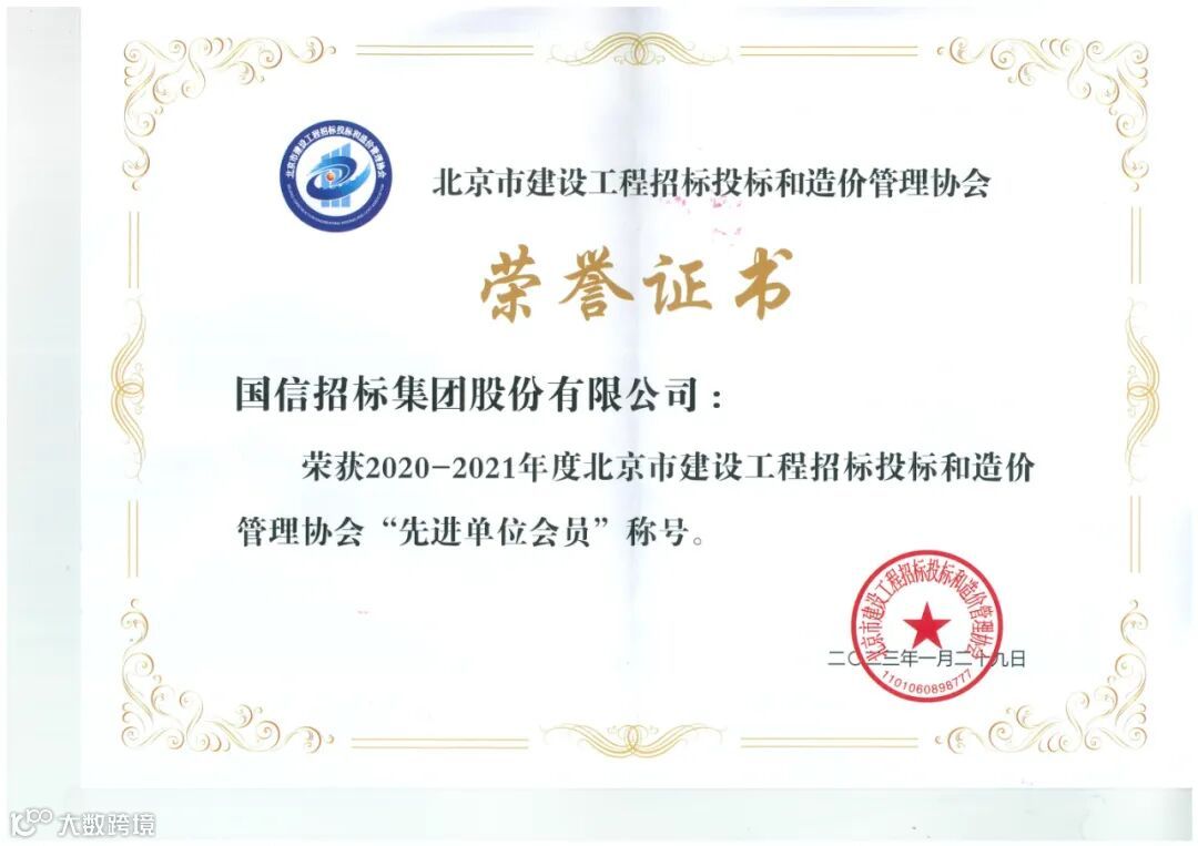 喜讯!国信招标集团荣获“2020-2021年度北京市建设工程招标投标和造价管理协会先进单位会员”荣誉称号