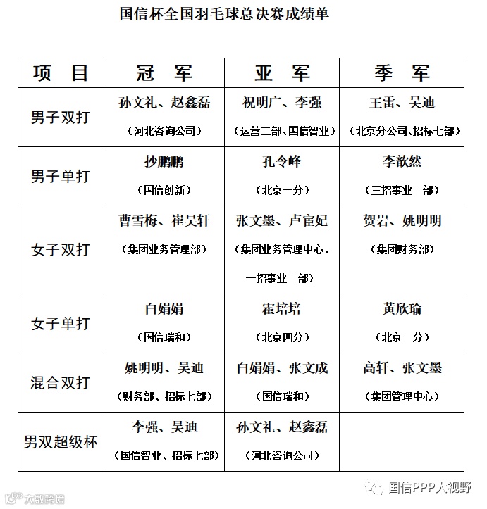 为庆祝国信招标集团20周年华诞,丰富员工业余生活、加强各单位间的交流沟通,10月17、18日,集团在北京金源红人运动俱乐部举办了2019年“国信人 谁羽争锋” 国信杯羽毛球比赛全国总决赛。由各单位选送的80余名羽毛球选手欢聚一堂,积极踊跃地参加了比赛。集团执行总裁柳泽伟到场为选手们加油助威,并为本次大赛开球。荆贵锁、胡剑、贺岩等集团领导作为运动员参加了本次大赛。