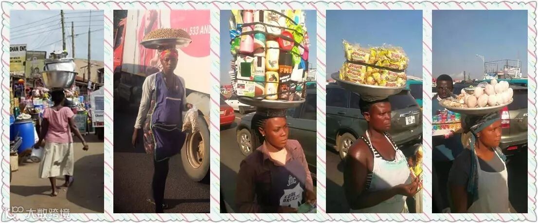 当然,我们的同事在感受到加纳人民热情的同时,也看到了他们的勤劳。上图是由当地女性组成的靓丽的风景线,在当地也称“头顶上的移动超市”。当地妇女将售卖的货物放在金属制的圆盘中,顶在头上,随街进行售卖,这样不仅使人们对于货物一目了然,同时还解放了双手,一举两得,让我们不禁感叹劳动人民勤劳的智慧。