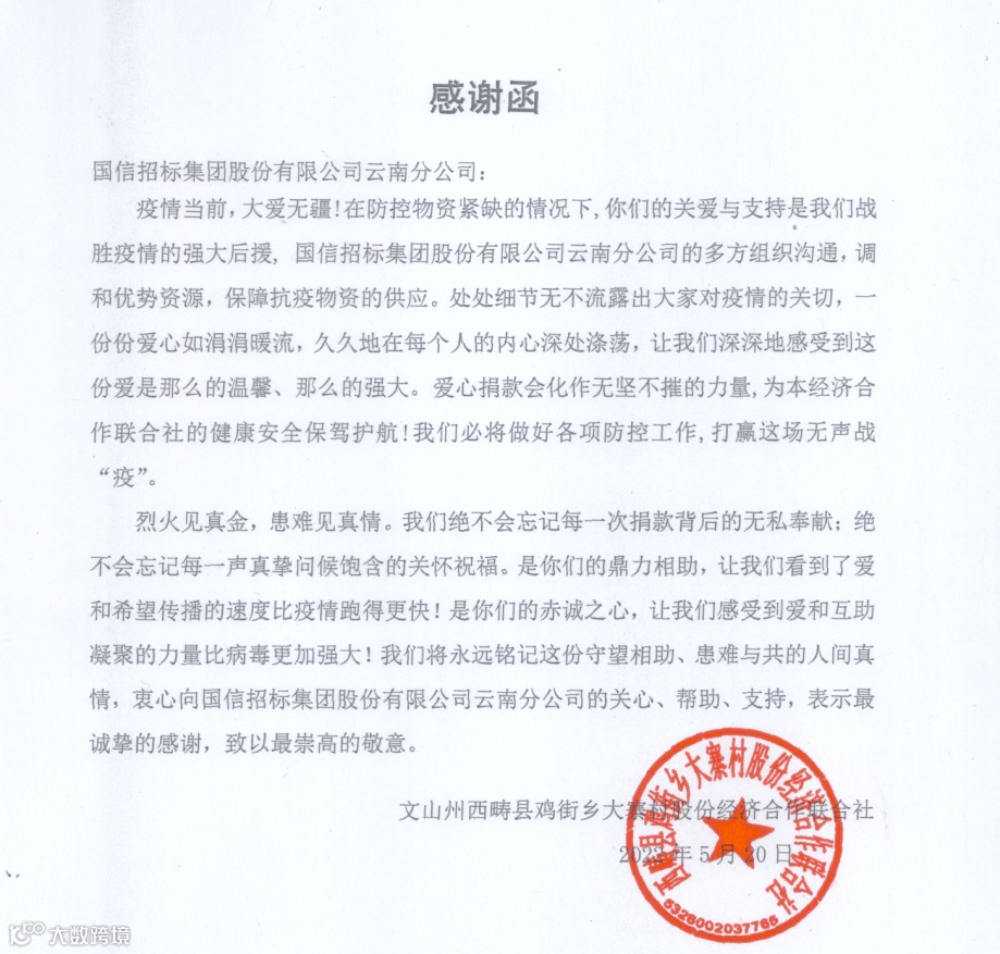 2022年新冠疫情严峻,国信招标集团股份有限公司云南分公司(以下简称“国信集团云南分公司”)积极响应国家防疫政策,构建招投标良好营商环境,助力防疫同心战。分公司多次参与社区疫情防控志愿者,积极走进农村,向云南省抗疫州县地区捐款2万元人民币,捐赠20多万元的防疫物资,包括一次性医用防护服、一次性医用隔离靴套、医用隔离面罩、消毒液、一次性医用外科口罩、75%乙醇消毒液、一次性医用隔离衣、一次性医用橡胶检查手套等。