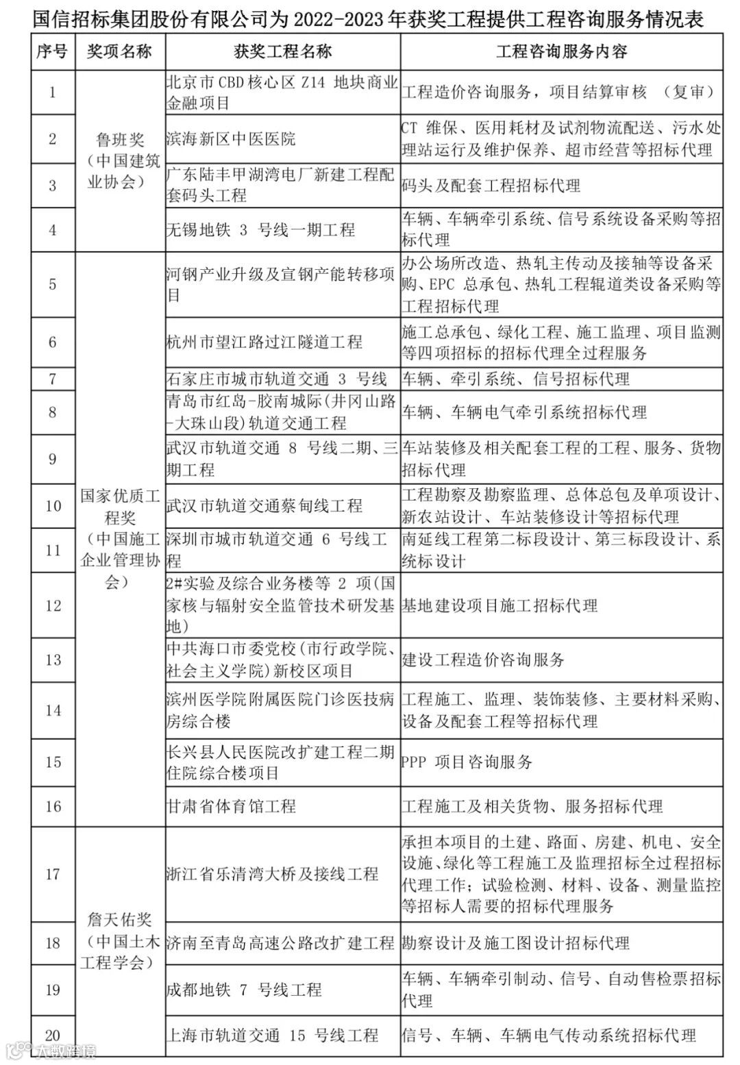 经过主办方京标价协数据核对和公示,最终发布结果:国信招标集团股份有限公司(以下简称“国信招标集团”)为2022-2023年4项鲁班奖、12项国家优质工程奖、4项詹天佑奖获奖工程提供招标采购咨询服务。