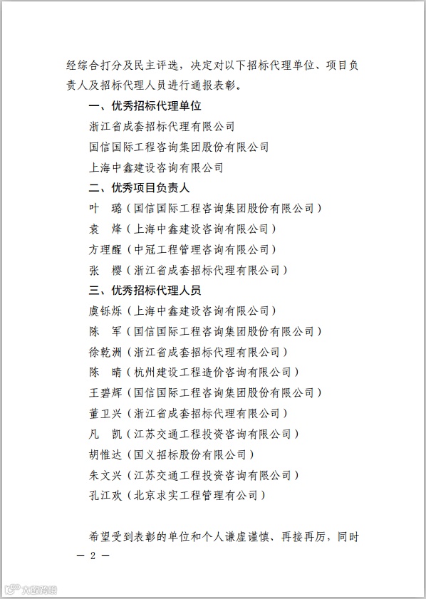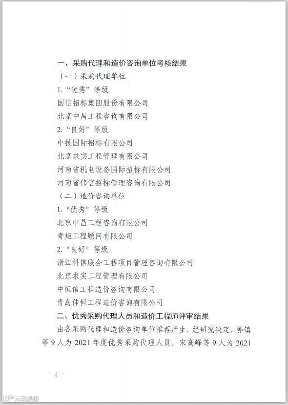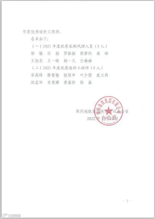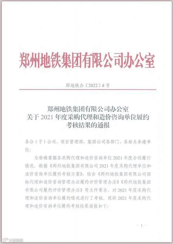 这里还有郑州地铁集团寄来的关于2021年度采购代理和造价咨询单位履约考核结果的通报,通报中国信招标集团股份有限公司获得采购代理优秀等级,轨道交通事业部的郭镇、白杨被评为优秀采购代理个人。