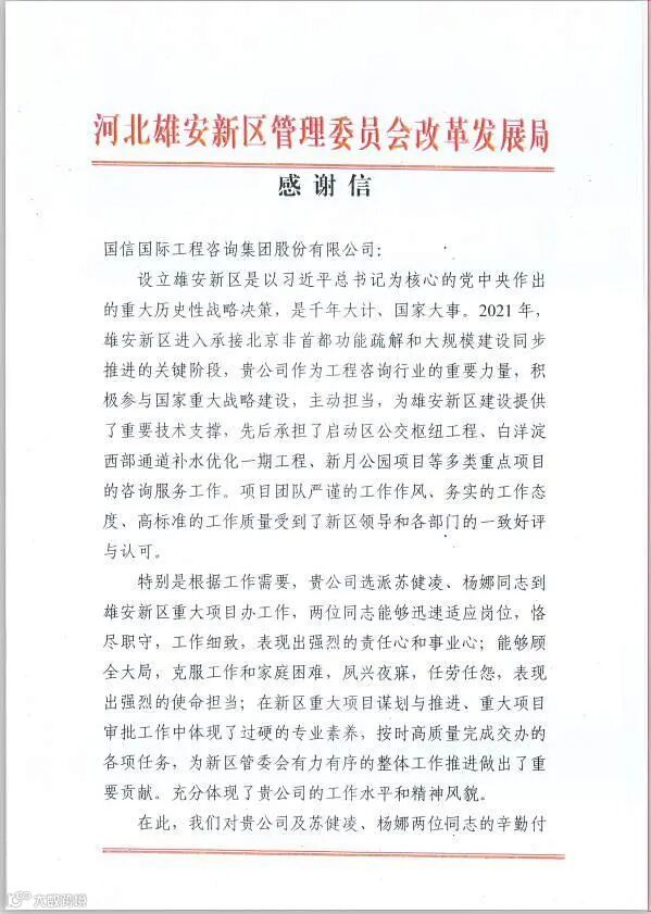 这里有河北雄安新区管理委员会改革发展局寄来的感谢信,信里评价国信作为工程咨询行业的重要力量,积极参与国家重大战略建设,主动担当,为雄安新区建设提供了重要技术支持。特别是选派驻场重大项目办的苏健凌、杨娜两同志,恪尽职守,工作细致,表现出强烈的责任心和事业心,能够顾全大局,任劳任怨,克服工作和家庭困难,表现出强烈的使命担当,在新区重大项目谋划与推进、重大项目审批工作中体现了过硬的专业素养,为新区管委会有力有序的整体工作推进做出了重要贡献。