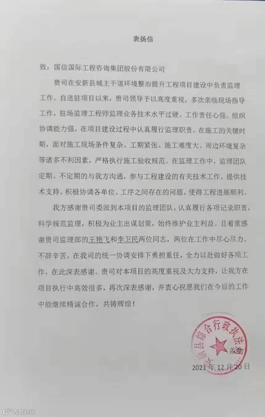 岁末年初,国信集团连续收到政府部门、委托单位寄来的表扬信、感谢信,字里行间表达出各界单位对集团在过去一年提供的优质服务的高度认可,对各团队认真负责、保质保量完成各项工作给予的充分赞誉。为客户提供优质的服务,做中国最值得信赖的工程咨询集成服务商是集团的使命与愿景,更是每位员工践行目标的决心体现。
