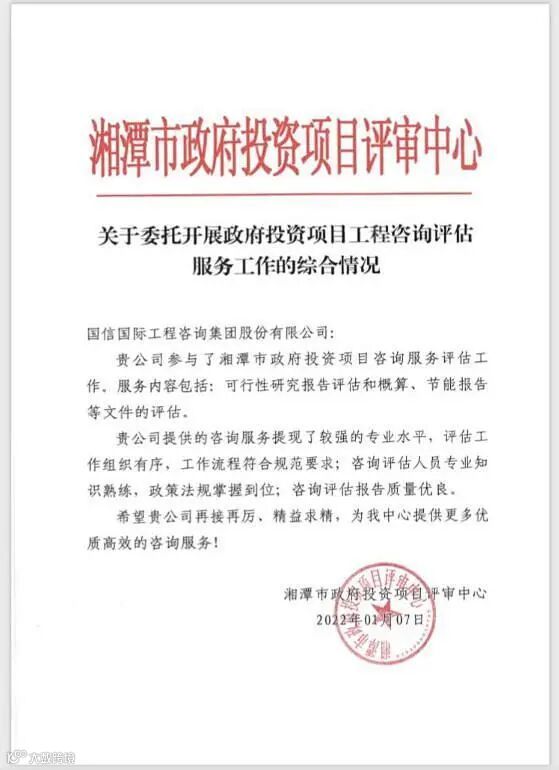 这里还有湘潭市政府投资项目管理中心的综合通报,高度评价湖南分公司在政府投资项目咨询评估服务工作中体现了较强的专业水平,评估工作组织有序,工作流程符合规范,评估咨询人员专业知识熟练,政策法规掌握到位;咨询评估报告质量优良。