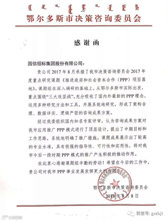 经过三年多的积累,国信招标集团在鄂尔多斯的业务开展已经具有一定规模,服务质量受到地方政府、社会及企业认可,在当地已经具有一定的影响力。截至2019年10月份,办事处累计承接咨询及招标项目30余项,总委托金额74.8亿元。在今后的发展道路上,国信招标集团鄂尔多斯办事处将不断总结成功经验,充分借助集团优势和资源,协调一致、有效配合,以提供更高的服务质量为目标,以一流的服务水平、严谨的工作作风、正规的运作方式为鄂尔多斯及周边地区提供专业的工程咨询服务。