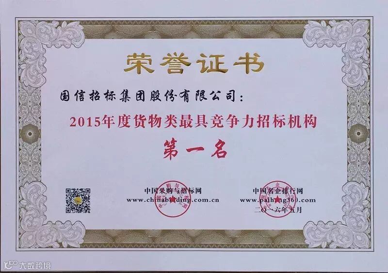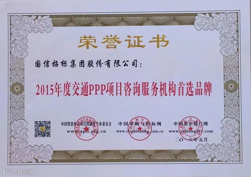 日前,从2016第十届全国招投标领域年度聚焦暨招标代理、PPP咨询服务机构评价组委会传来喜讯,在刚刚揭晓的2015年度中国最具竞争力招标机构百强榜单和2015年度中国PPP咨询服务机构百强榜单上,国信招标集团股份有限公司一举囊括12项大奖,分别是:2015年度中国PPP项目咨询服务机构百强第二名、2015年度交通PPP项目咨询服务机构首选品牌、2015年度环保PPP项目咨询服务机构首选品牌、2015年度市政基础设施PPP项目咨询服务机构首选品牌、中国招标代理行业35年35家标杆企业、2015年度中国招标代理五星级优质服务奖、2015年度中国招标机构十大顶级品牌、2015年度中国阳光招标奖、2015年度中国最具竞争力招标机构百强第一名、2015年度货物类最具竞争力招标机构第一名、2015年度铁路行业招标机构首选品牌第一名、2015年度轨道交通行业招标机构首选品牌第一名等奖项。 此外,集团多人荣获个人奖项,其中,集团总工程师荆贵锁获得2015年度中国招标代理行业优秀职业经理人称号;李长军、童再军、于道德、王海涛、杨晓敏、李炼、高轩、高存红、裴明辉、李晓辉当选2015年度中国PPP项目金牌咨询工程师;鲁峰林、马晓晴、孙占海、魏岩萌、马锋、张云良、王媛、郭培晨、李群堂、张岱当选2015年度中国金牌招标师。