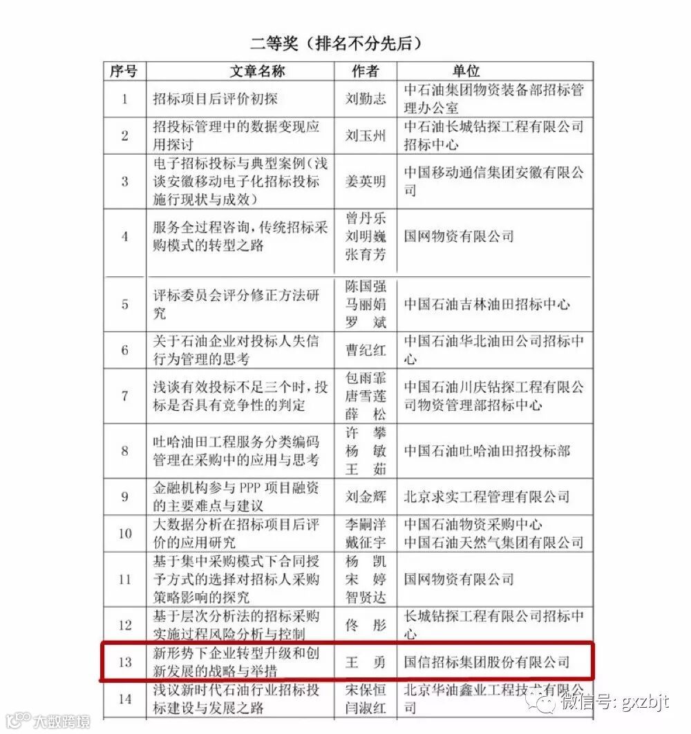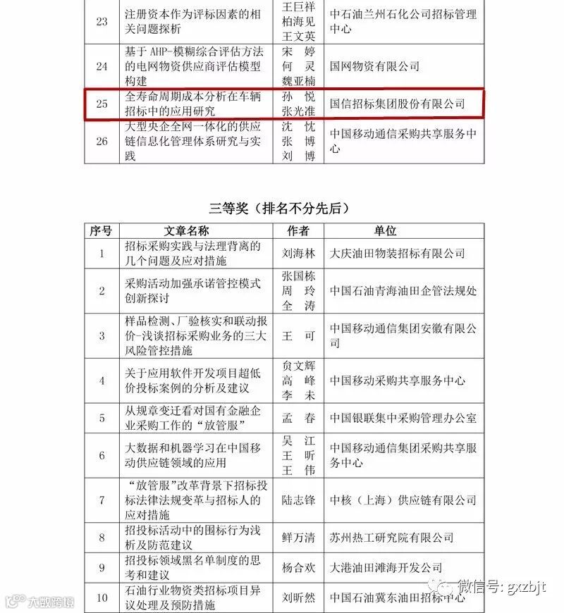 经评审,国信招标集团等9家单位荣获优秀组织单位奖。国信招标集团研究院招标中心主任陈尚聪的论文《招标采购活动实施效果评价与分析》获得一等奖,集团PPP办公室主任王勇的论文《新形势下企业转型升级和创新发展的战略与举措》、集团总裁助理孙悦及项目经理张光准的论文《全寿命周期成本分析在车辆招标中的应用研究》获得二等奖。