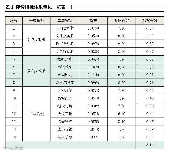 评价指标体系量化采用专家打分法,专家对第二层级的每个评价指标进行评审打分,再根据每个指标的评审打分和指标权重加权计算得出本项目最终的评价结论。