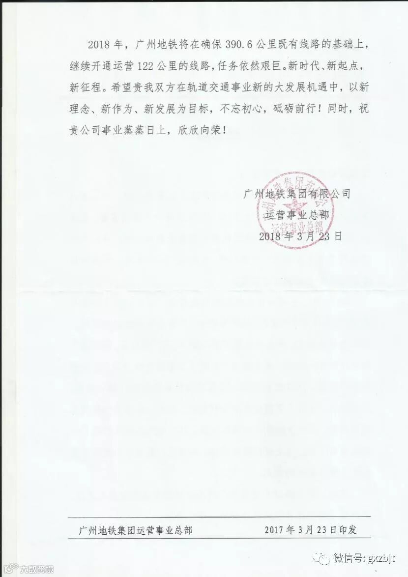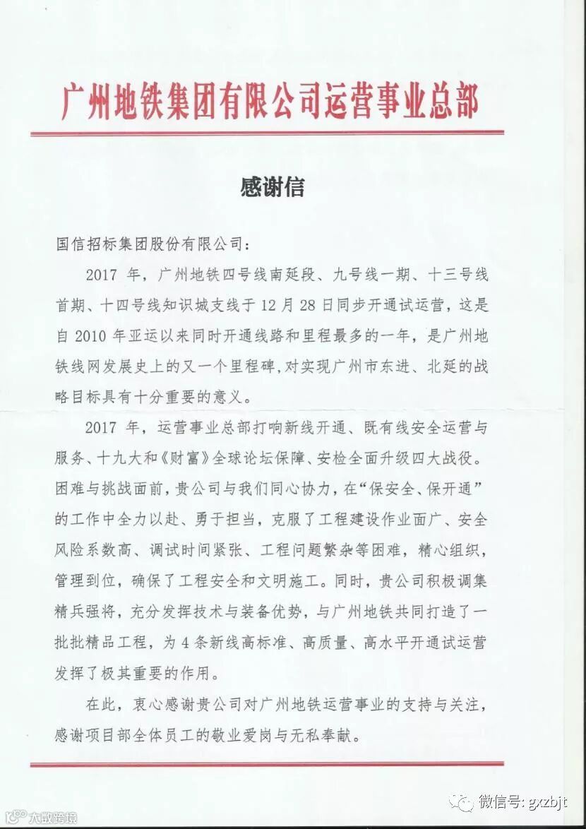 2018年3月23日,国信招标集团应邀出席广州地铁集团有限公司运营事业总部2017年“攻城拔寨”及“双保”工作总结暨表彰大会,并获得感谢信。