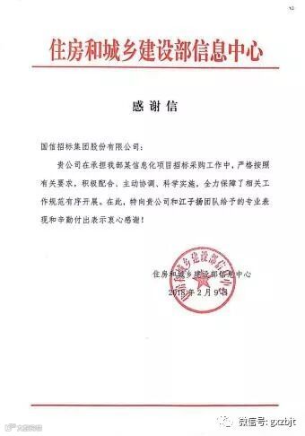 日前,受住房和城乡建设部委托,国信招标集团对某信息化项目系统集成、某信息化项目监理项目、住房城乡建设部信息系统资源整合项目应用软件开发部分等三个项目组织招标。在服务过程中,项目组团队(江子扬团队)通过认真负责的态度和专业严谨的服务,严格按照国家相关法律法规要求,优质高效地完成了项目的招标代理工作,获得了住房和城乡建设部信息中心的高度认可,并于2018年2月9日发出感谢函。