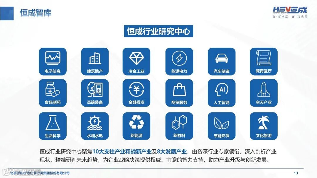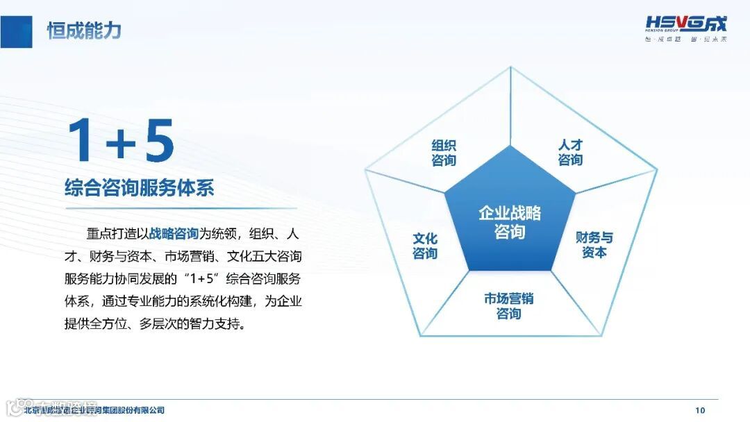 聚焦国家战略需求,恒成集团深耕实体经济产业,覆盖电子信息、建筑地产、能源电力、汽车制造、人工智能、生命科学等 10 大支柱产业和战新产业,以及 8 大发展产业,形成针对性的行业服务能力。集团重点打造以战略咨询为统领,组织、人才、财务与资本、市场营销、文化五大咨询服务协同发展的 “1+5” 综合咨询服务体系,推出 “恒成陪跑”“恒成专精”“恒成传承”“恒成出海” 等定制化产品服务。通过 “沉浸式咨询服务” 模式,深入企业经营全过程,从短期项目合作升级为长期战略陪伴,为企业提供管理诊断、战略规划、组织变革、人才培养、资本运作等全方位智力支持,助力产业转型升级。