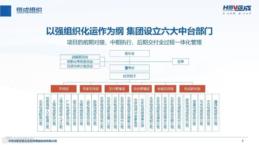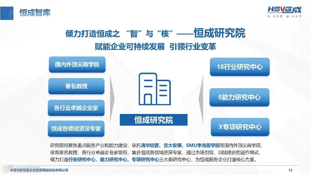 恒成集团构建“咨询+产业+人才”三位一体的业务布局,和持“人才为本,价值为魂,客户为根,成功为要”的核心价值观,恒成智远以持续创新为发展动力,以专业智库为战略支撑,致力于为实体经济企业提供高价值管理智慧解决方案,推动产业转型升级和高质量发展,助力中国企业提升全球竞争力。