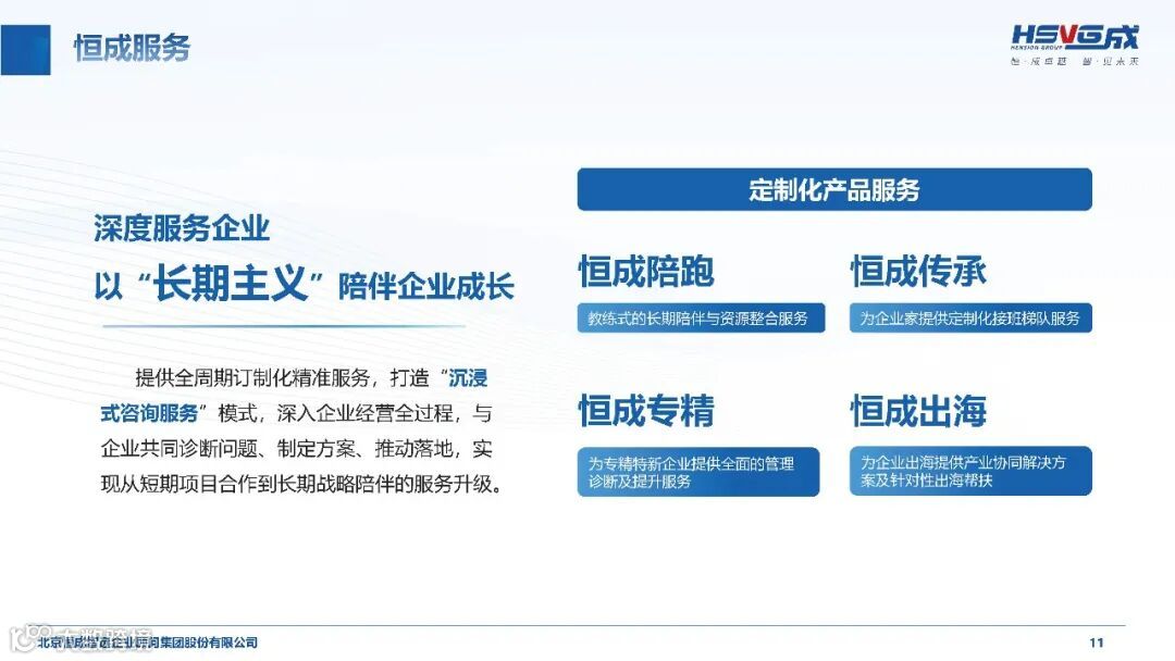 其子公司恒成陪跑聚焦国家级“专精特新小巨人”及以上企业,通过管理咨询、资本、陪跑为企业提供综合陪跑服务和系统解决方案,与企业家团队共同创新,一起完成思考和价值倍增的顶层设计,携手同行,将一张蓝图绘到底。
