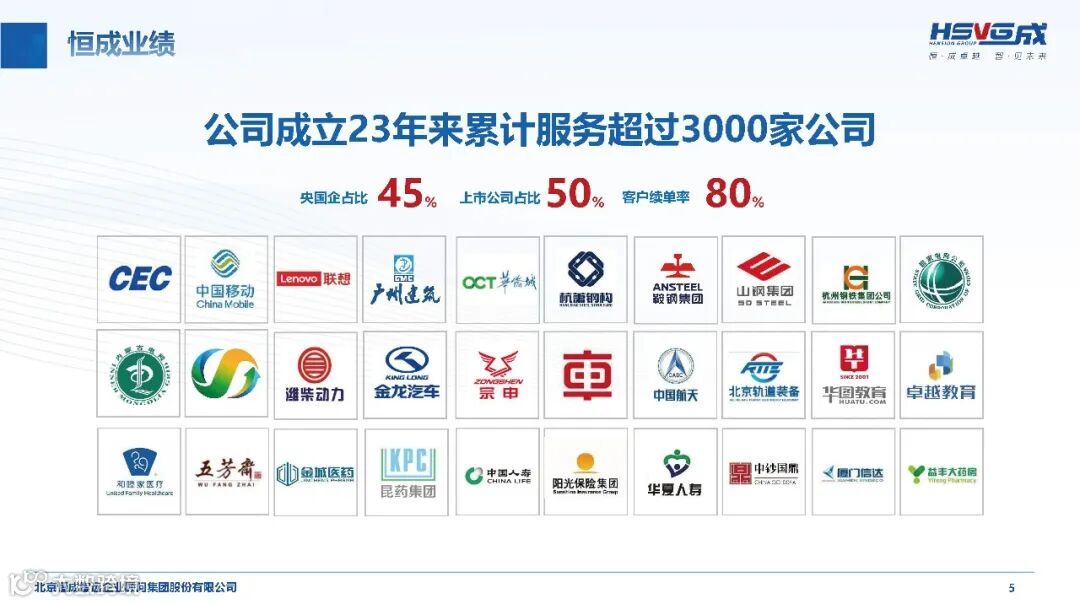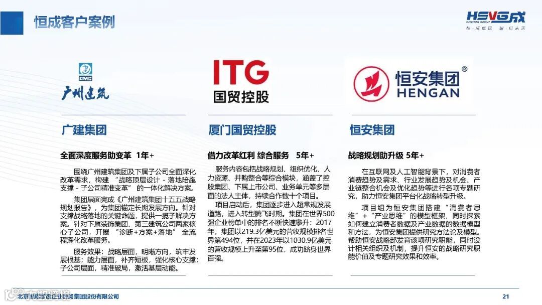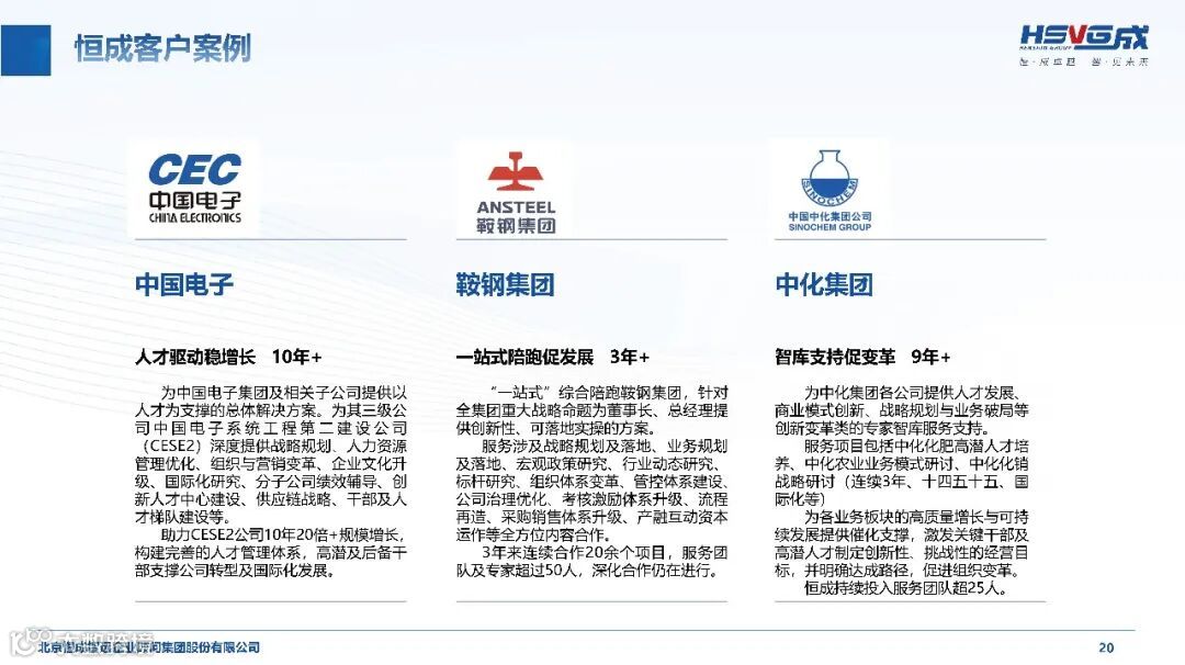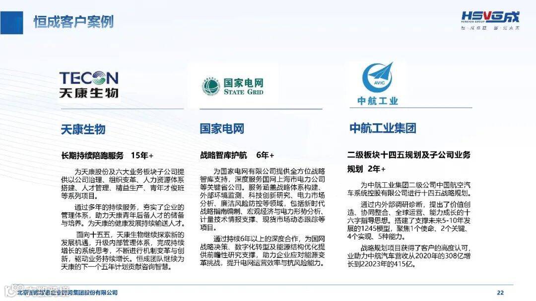 二十三年来,恒成集团以专业服务成就众多企业的成长传奇:为中国电子系统工程第二建设公司提供 10 年 + 深度服务,助力其实现 20 倍规模增长;“一站式” 陪跑鞍钢集团 3 年 +,完成 20 余个合作项目,覆盖战略规划、组织变革等全方位内容;陪伴厦门国贸控股 5 年 +,助力其从世界 500 强第 494 位跃升至第 95 位;为天康生物提供 15 年 + 持续服务,夯实企业管理体系与人才储备。从国家电网的战略智库护航,到中航工业的十四五规划落地,恒成集团用一个个实打实的案例证明,以长期主义陪伴企业成长,是实现共赢的核心密码。