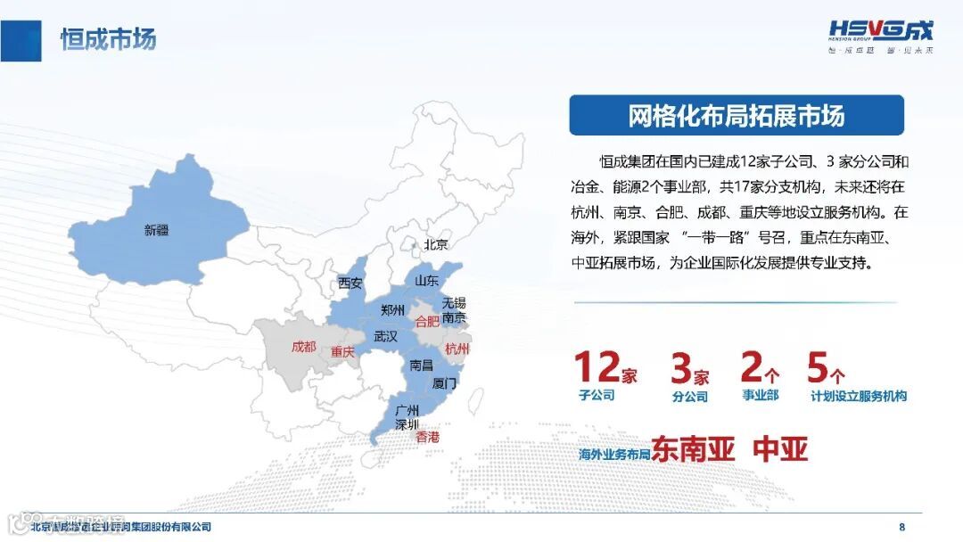 在国内,集团已建成 12 家子公司、3 家分公司及冶金、能源 2 个事业部,形成覆盖北京、深圳、广州、杭州等核心城市的网格化服务布局,未来还将在南京、合肥、成都等地增设服务机构;在海外,紧跟 “一带一路” 倡议,重点布局东南亚、中亚市场,新加坡、迪拜、马来西亚等海外公司的设立,为企业国际化发展提供专业支撑。600 平方米的开放办公区、完善的中台运营体系,让集团实现项目前期对接、中期执行、后期交付的全过程一体化管理,为客户提供高效便捷的服务体验。
