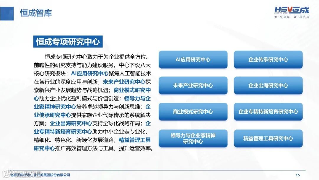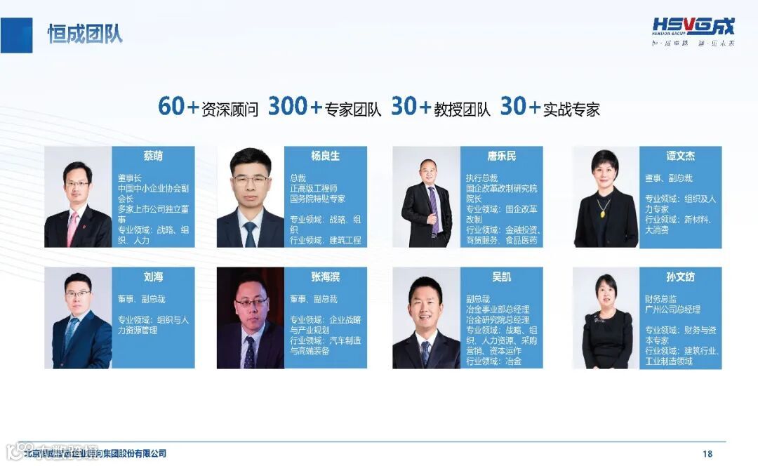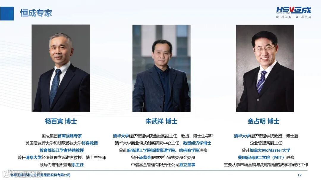 作为具有全球影响力的华商智库,恒成集团构建了一支由 60 + 资深顾问、300 + 专家团队、30 + 教授团队及 30 + 实战专家组成的核心力量。集团总裁杨良生先生作为正高级工程师、国务院政府特殊津贴专家,拥有丰富的产业战略与企业管理实践经验;首席战略专家杨百寅博士、金融领域专家朱武祥博士等一批来自清华大学等顶尖院校的教授学者,为集团提供坚实的理论支撑。恒成研究院更是整合国内外顶尖商学院资源、行业卓越企业家及内部资深专家,设立 18 个行业研究中心、5 个能力研究中心及多个专项研究中心,聚焦行业趋势研判与核心能力建设,为服务企业打造权威前瞻的智力支撑体系。