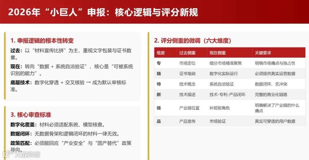 2026 年专精特新 “小巨人” 申报工作已进入筹备关键期,与往年不同,今年的申报逻辑发生本质性变革。不再是 “材料写得好不好” 的文字博弈,而是聚焦 “数据能否经得起数字化穿透 + 交叉核验” 的硬实力比拼。《优质中小企业梯度培育管理暂行办法》指引下,数字化审核成为核心趋势,“专、精、特、新、链、品” 六大维度评分标准虽未调整,但评审重心已转向 “系统可识别的能力”,缺乏数据支撑与逻辑闭环的申报材料将失去竞争力。
