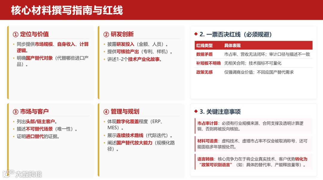适配数字化审核新生态:企业还需建立三大核心认知,以适配 2026 年申报新生态。首先,数字化审核是默认前提,申报材料不仅面向专家,更要满足系统、模型及核查机制的审核要求,单纯文字漂亮无数据支撑将直接出局;其次,市占率实行 “反向核验”,即使政策不强制第三方证明,缺乏行业规模来源、客户合同支撑及计算逻辑的市占率数据,将被系统自动怀疑;最后,申报材料具备 “可追责性”,虚构技术、虚增市占率等行为,不仅会导致本次申报失败,还将面临取消称号、多年禁报的严厉处罚。