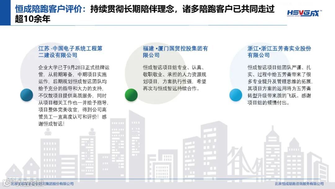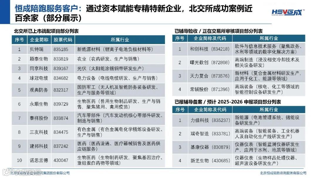 凭借专业的服务能力,恒成陪跑已助力近百家企业实现北交所上市,服务案例覆盖贝特瑞、观典防务、诺思兰德等各领域专精特新标杆,同时深度陪伴 2000 + 企业成长,服务对象囊括大型民企、上市公司、央国企等多种类型,行业遍及制造、生物医药、消费等多个赛道。其服务成效获得客户高度认可,中国电子系统工程第二建设有限公司、厦门国贸控股、五芳斋等企业均对其专业能力与服务价值给予充分肯定,众多客户已与恒成陪跑保持超 10 年的长期合作,印证了品牌的专业实力与长期服务价值。