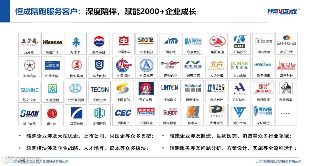 北京恒成陪跑咨询服务有限公司隶属于北京恒成智远企业顾问集团,聚焦国家级 专精特新“小巨人” 及以上企业的综合智力服务机构。其秉持 “恒・成卓越,智・见未来” 的品牌理念,以 “成为企业智力服务行业转型升级标杆机构” 为发展追求,致力于成为有梦想企业家可信赖的长期战略合作伙伴,核心使命是 “陪跑成就有价值企业”。依托 20 余年行业积累、200 + 专家顾问团队以及 5000 + 服务客户的深厚沉淀,恒成陪跑始终以企业价值倍增为结果导向,与企业家团队协同完成价值增长顶层设计,实现蓝图落地的全周期陪伴。