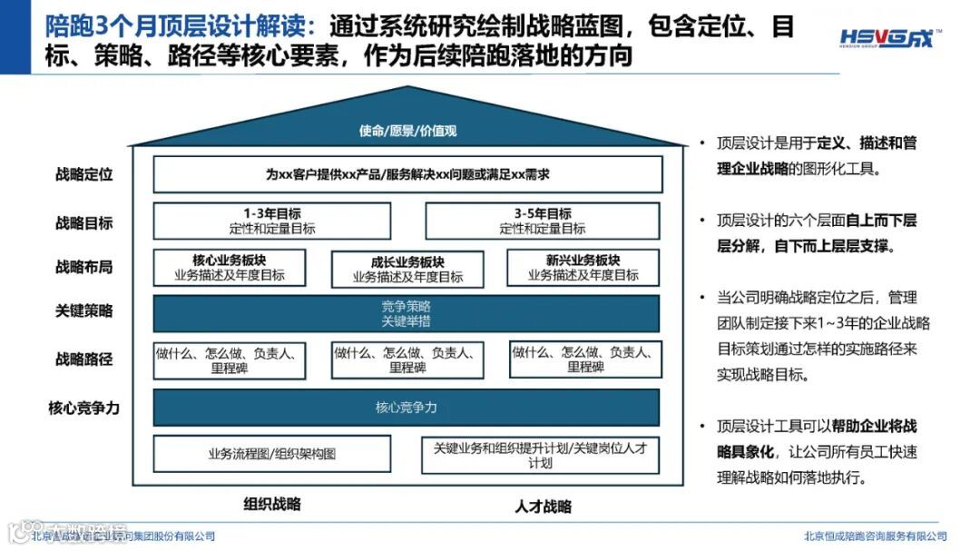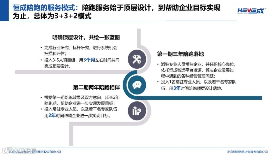 恒成陪跑独创3+3+2特色服务模式,从顶层设计到长期陪跑形成完整服务闭环。前期将投入 3-5 人专业项目组,用 3 个月时间完成行业研究、标杆分析与系统机会评估,为企业搭建涵盖使命愿景、战略定位、目标路径、组织架构等六大层面的战略蓝图,让企业战略具象化、可落地。在此基础上,第一期开启 3 年陪跑落地服务,派驻专业人员常驻企业核心岗位,依托集团平台资源解决经营管理难题;第二期可根据合作成效延长 2 年陪跑期,配备常驻人员与专家团队,助力企业深化发展目标,实现从战略规划到落地执行的全链路赋能。