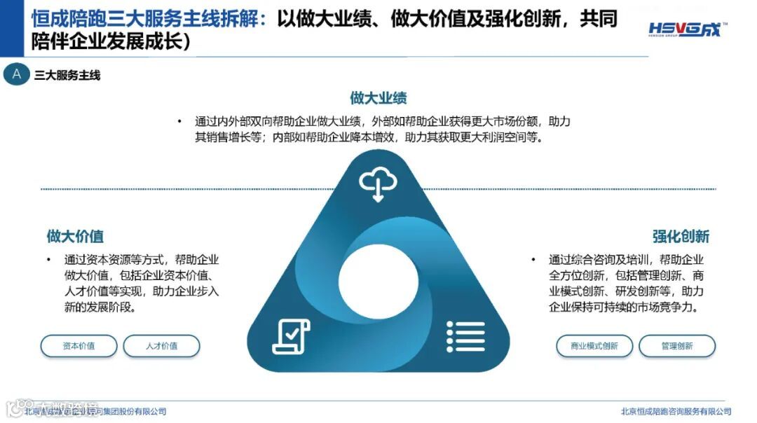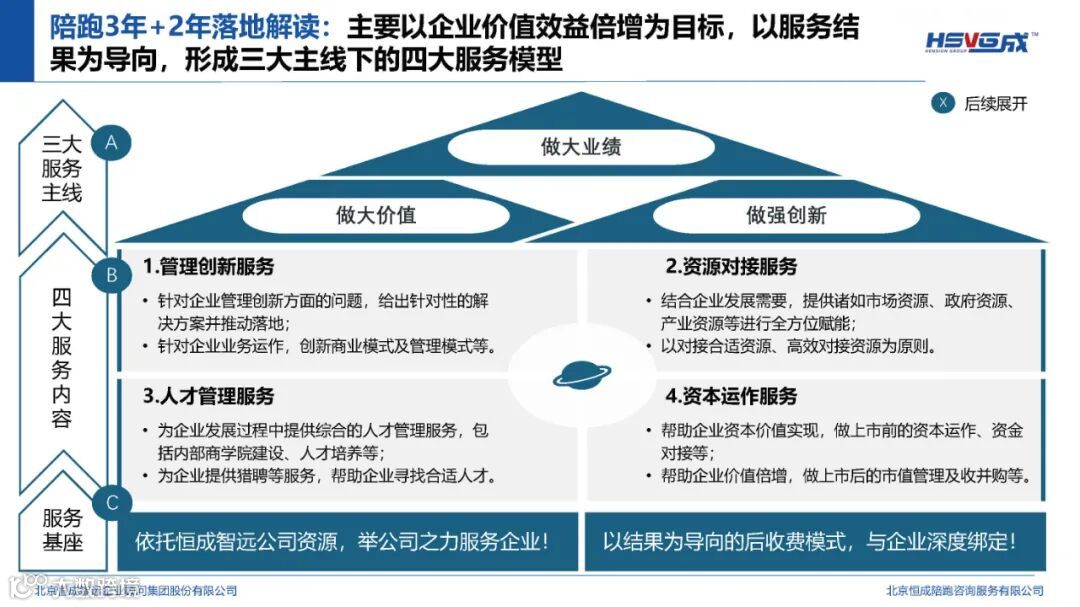恒成陪跑围绕做大业绩、做大价值、强化创新三大服务主线,构建起四大核心服务模型,为企业提供全方位解决方案。在管理创新服务上,覆盖战略、营销、人力、财务等十余类咨询方向,针对性解决企业管理痛点;资源对接服务可链接市场、政府、产业、科研等多领域优质资源,通过模式、科技、资本、资产四维赋能为企业发展加码;人才管理服务贯穿人才全生命周期,提供人才规划、猎聘、培养、部署等一体化支持;资本运作服务则涵盖投融资顾问、直接投资、并购重组、上市辅导等全流程服务,以结果为导向助力企业实现资本价值跃升。