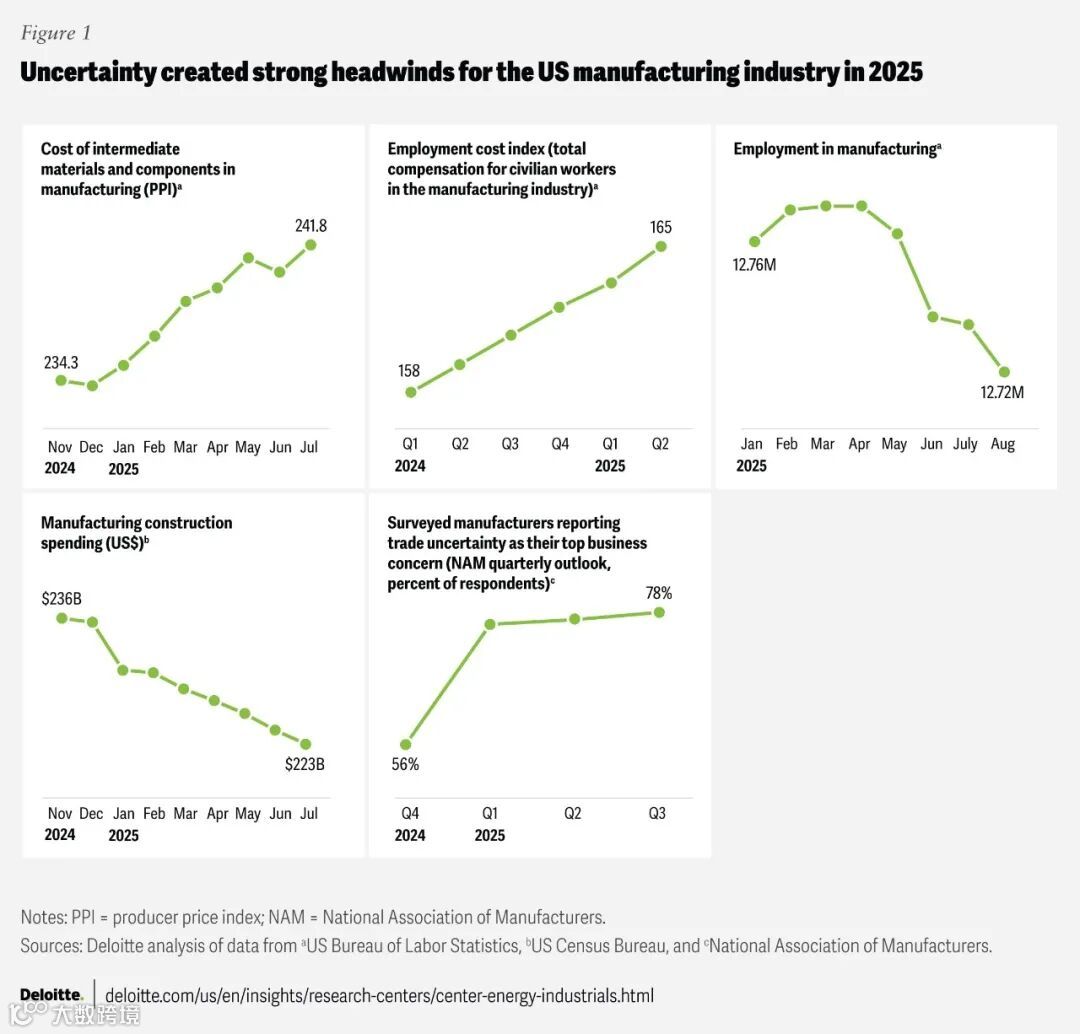 2025年,美国制造业面临严峻的经济环境。供应管理协会的制造业采购经理指数在今年大部分时间保持在50以下,显示该行业出现收缩。成本上升,就业减少,制造业建设支出——新建或扩建设施投资的指标——稳步下降(见图1)。这些挑战在很大程度上源于贸易政策的不确定性和关税。超过四分之三的制造商在2025年全国制造商协会季度展望调查中持续将贸易不确定性列为首要关注点。