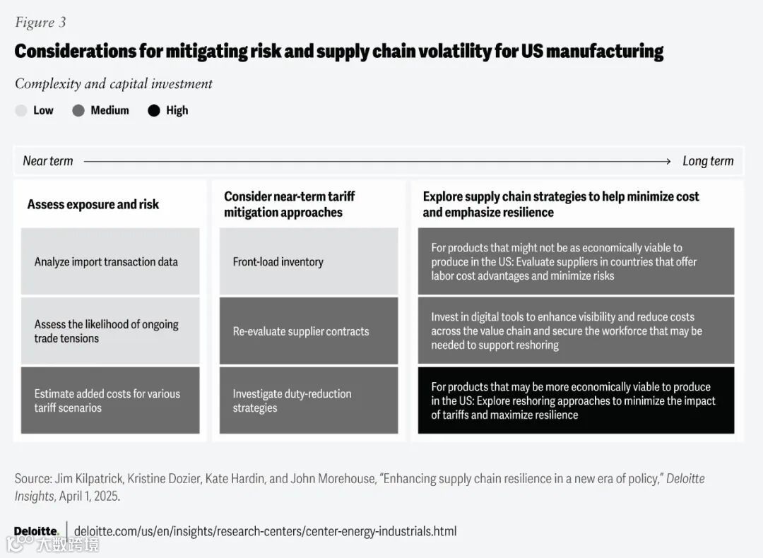 贸易和关税格局的变化导致2025年美国制造商面临不确定性和成本上升,企业采取了多种策略,从前期装货到重新评估供应链结构(见图3)。尽管有这些努力,78%的制造商在全国制造商协会“2025年第三季度制造商展望调查”中表示,贸易不确定性仍是他们的首要关注点,预计未来一年投入成本平均将增长5.4%。
