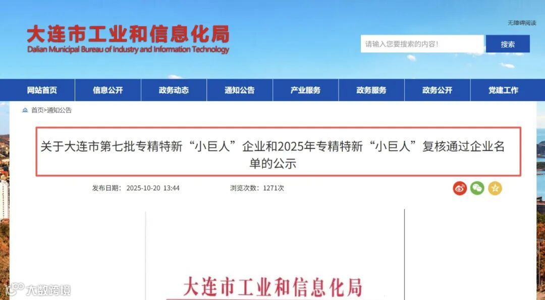 2025年10月20日,大连市工业和信息化局发布公示,15家企业入选2025年第七批专精特新“小巨人”企业名单,18家企业通过第四批“小巨人”企业复核,33家企业共同为大连优质中小企业梯度培育版图添上浓墨重彩的一笔。