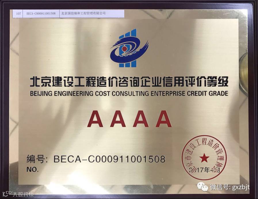 经过主办方专家客观、公正的评选,国信招标集团子公司——北京国信瑞和工程管理有限公司被评为北京建设工程造价咨询企业信用评价AAAA级。