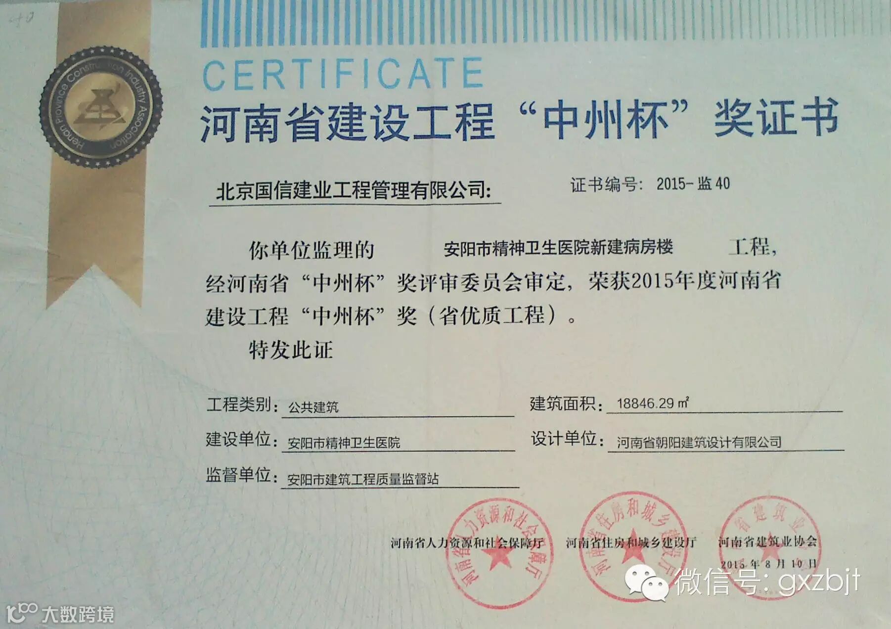 2015年8月10日,由北京国信建业工程管理有限公司监理的安阳市精神卫生医院新建病房楼项目荣获河南省建设工程“中州杯”奖。