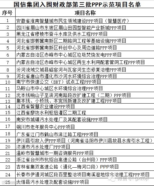 2016年10月11日,财政部会同19个部委(国家局)联合公布第三批PPP示范项目,确定516个项目,计划总投资金额11,708亿元。其中,由国信招标集团承担咨询及招标工作的有25个项目,计划总投资金额422.6亿元,占比分别达4.8%和3.6%。